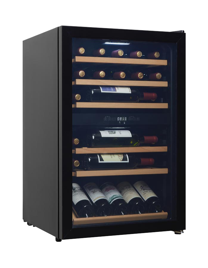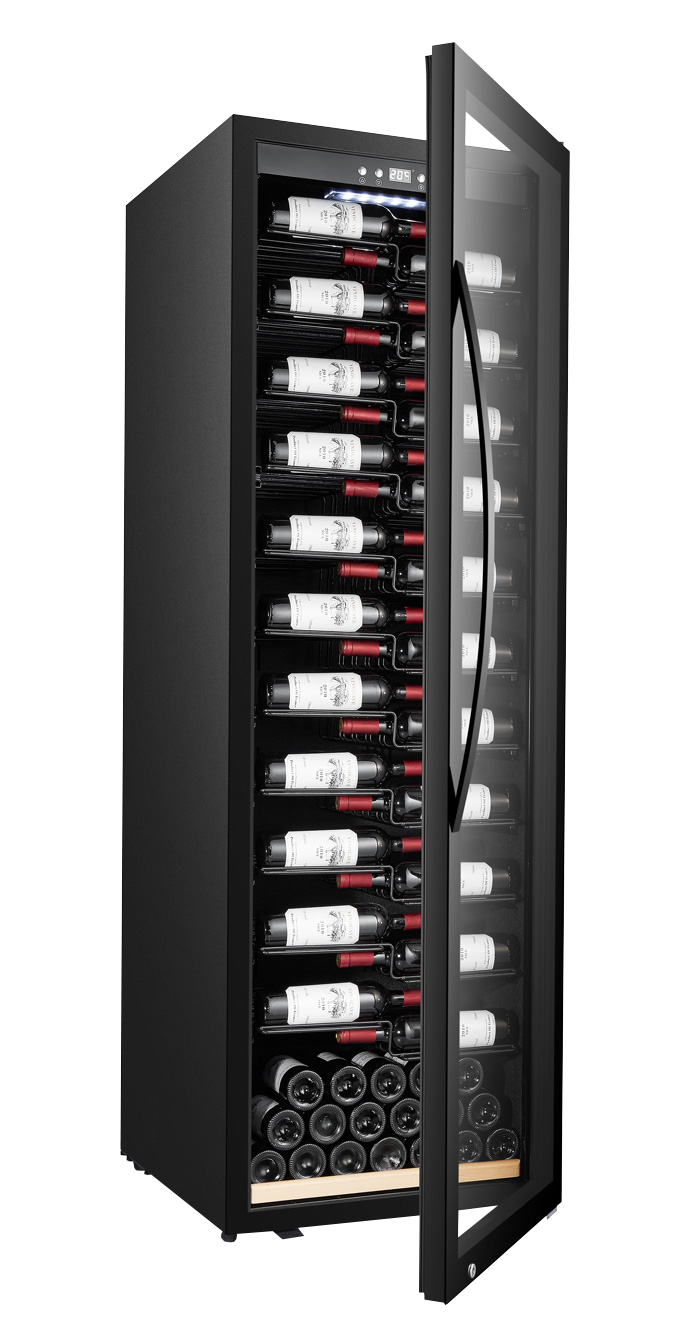 Modern och stor vinkyl med 11 utdragbara hyllor i label-view-modell som gör vinflaskornas etiketter väl synliga. Den svarta vinkylen är fristående och utrustad med en justerbar temperaturzon, ergonomiskt handtag och en UV-skyddad glasdörr som skyddar vinerna från skadligt solljus. Vinkylen rymmer 153 flaskor.