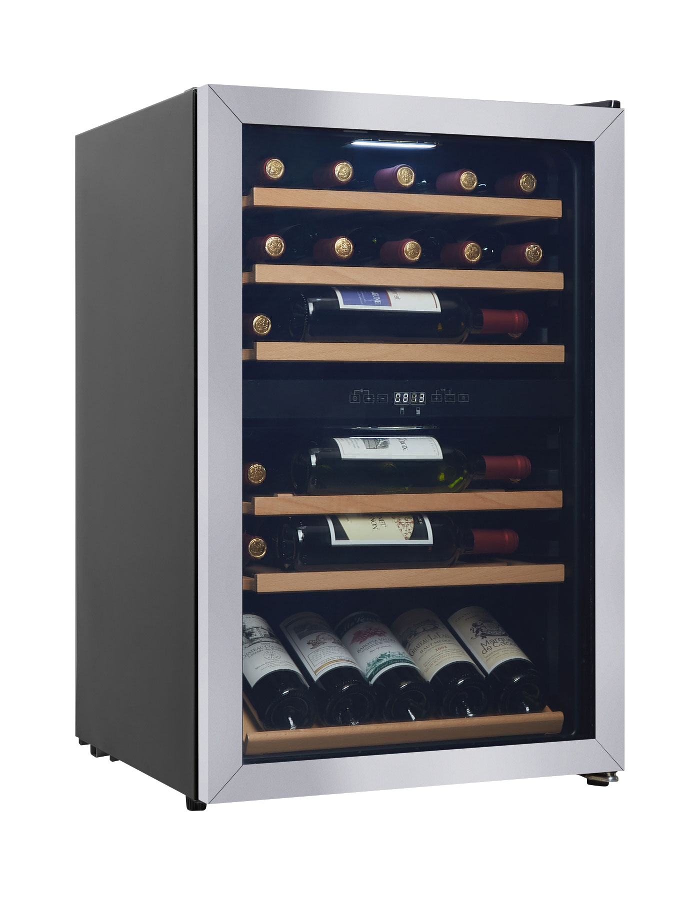 Fristående vinkyl med två justerbara temperaturzoner och plats för 37 flaskor. Vinkylen från skandinaviska Cavin har en UV-skyddad glasdörr, elektronisk reglering och kompressorkylning. Längst ner i vinkylen finns en displayhylla som ger dig möjligheten att visa upp ett urval av de vinerna du tycker om lite extra.