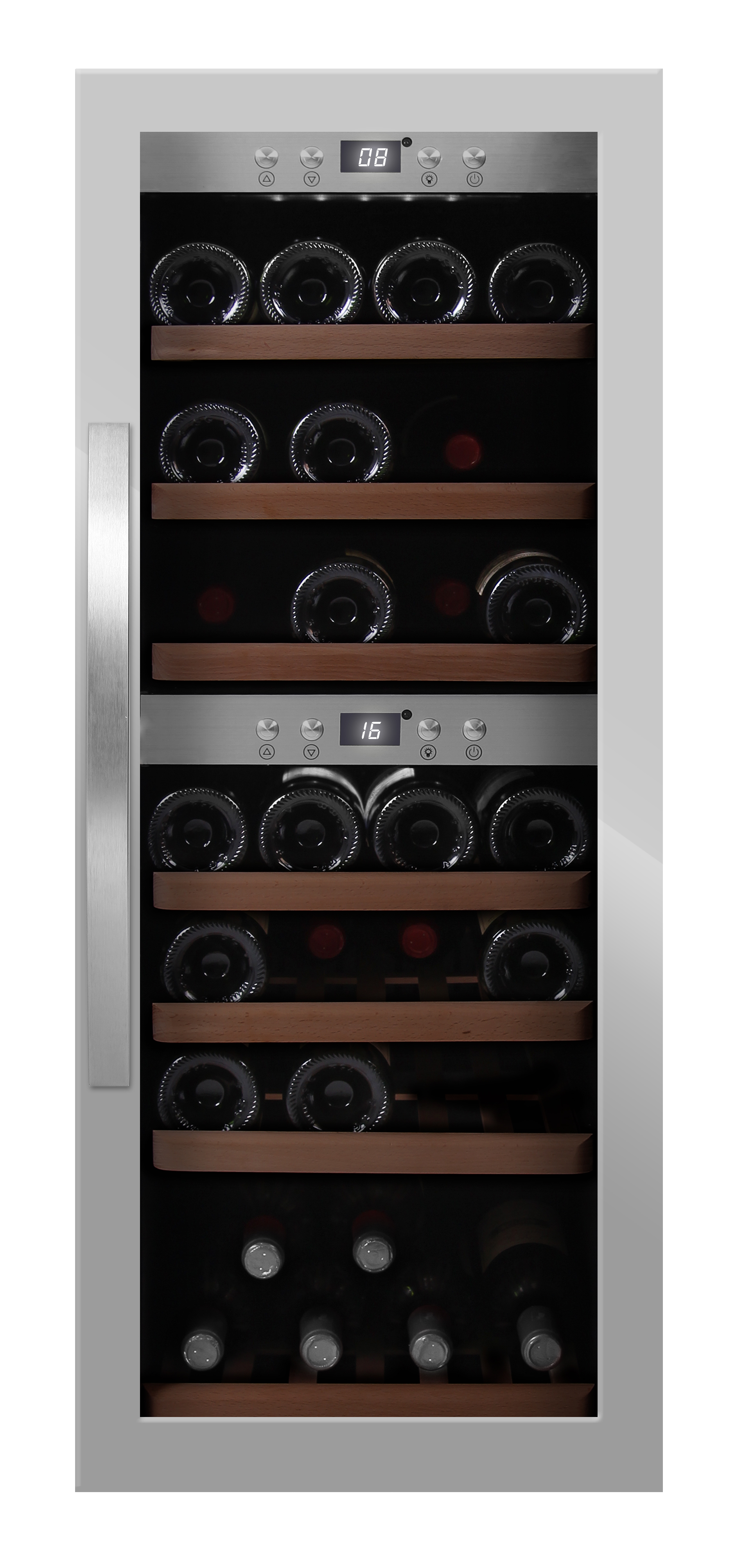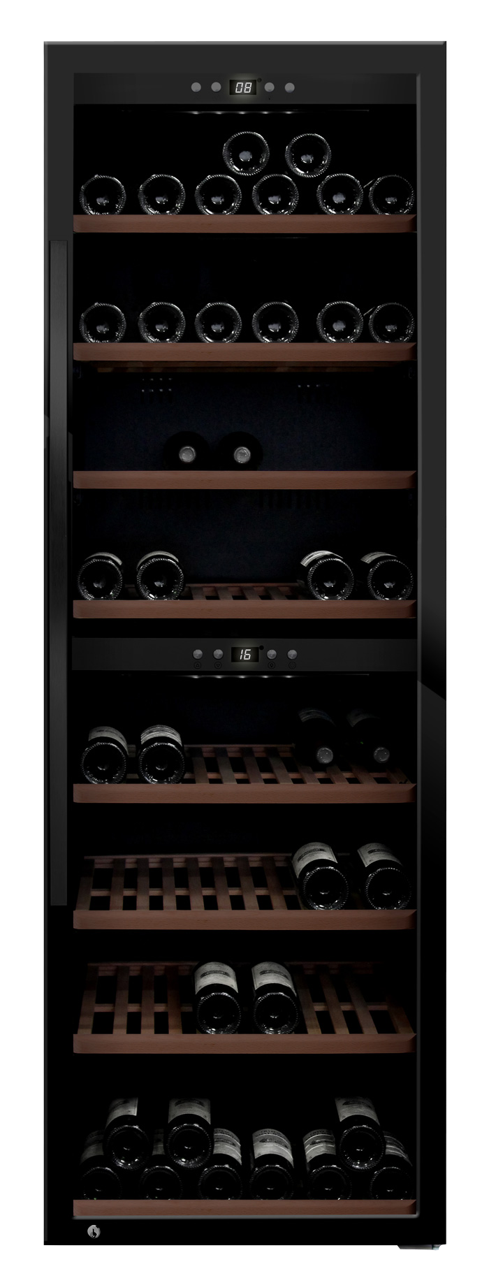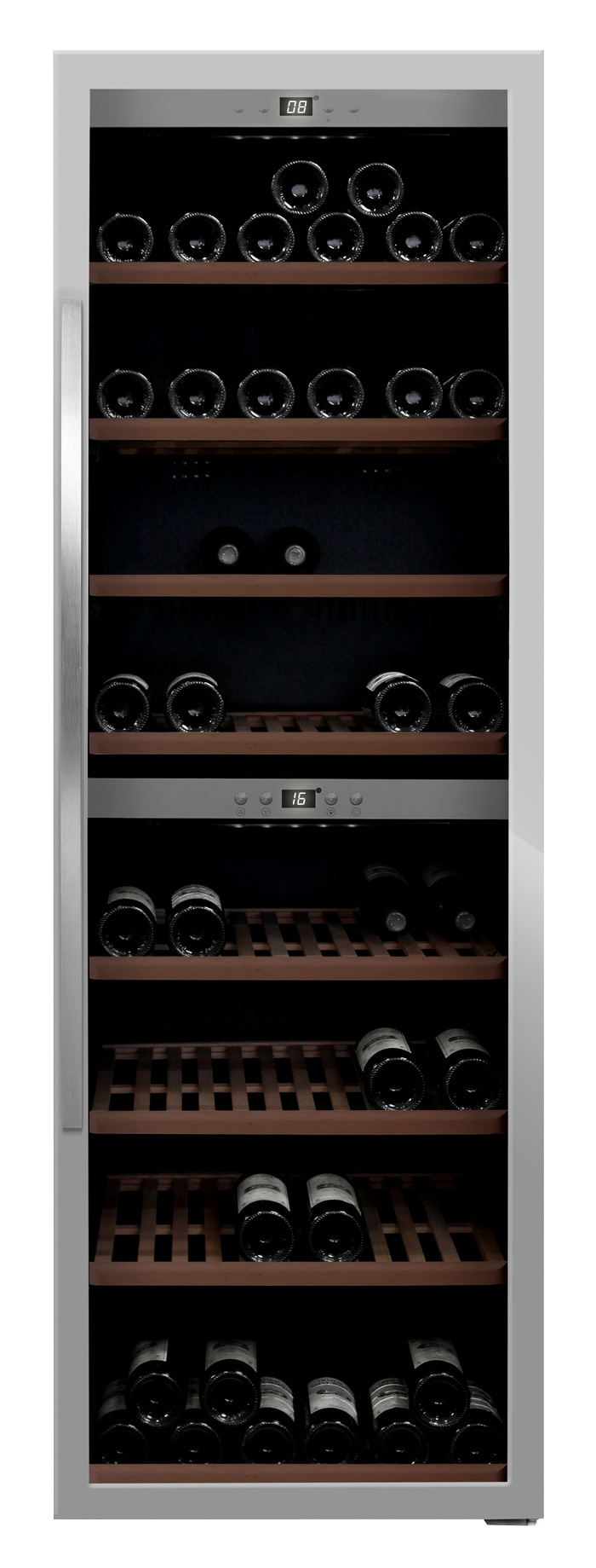 Stor fristående vinkyl i modern design, tillverkad i Danmark. Vinkylen har en ställbar temperatur i toppen och botten, övergången däremellan sker gradvis. Vinkylen har plats till 197 flaskor och kommer med en elegant presentationshylla!