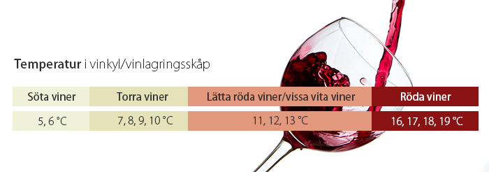 Vin lagras som bäst vid en temperatur på 12 grader. Mindre temperaturskillnader (10-14 grader) är dock okej, men konstant temperatur är hemligheten för bra vinlagring. Observera att det är en skillnad på lagringstemperatur och serveringstemperatur. Om du är intresserad av att lagra vin under flera års tid bör du investera i ett vinlagringsskåp som håller konstant 12 grader. Om vinet ska avnjutas inom 1-1,5 års tid, satsa på en vinkyl som alltid håller korrekt serveringstemperatur istället!