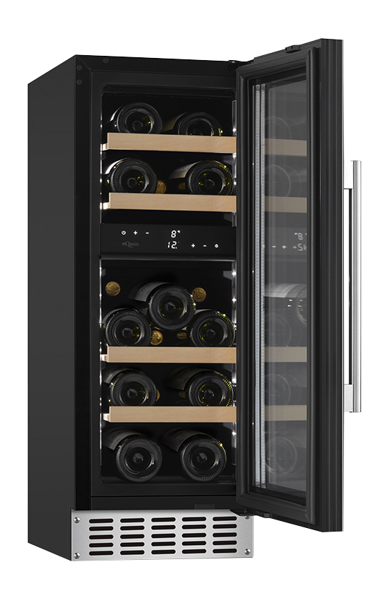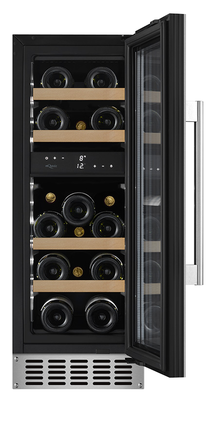 Stilren och energisnål vinkyl från mQuvée i rostfri design och seamless-door (dörr utan skarvar). Vinkylen passar perfekt som inbyggd under köksbänken, men gör sig även snygg som fristående. Vinkylen har två temperaturzoner, kolfilter, 4 utdragbara hyllor i trä och plats för 16 flaskor.