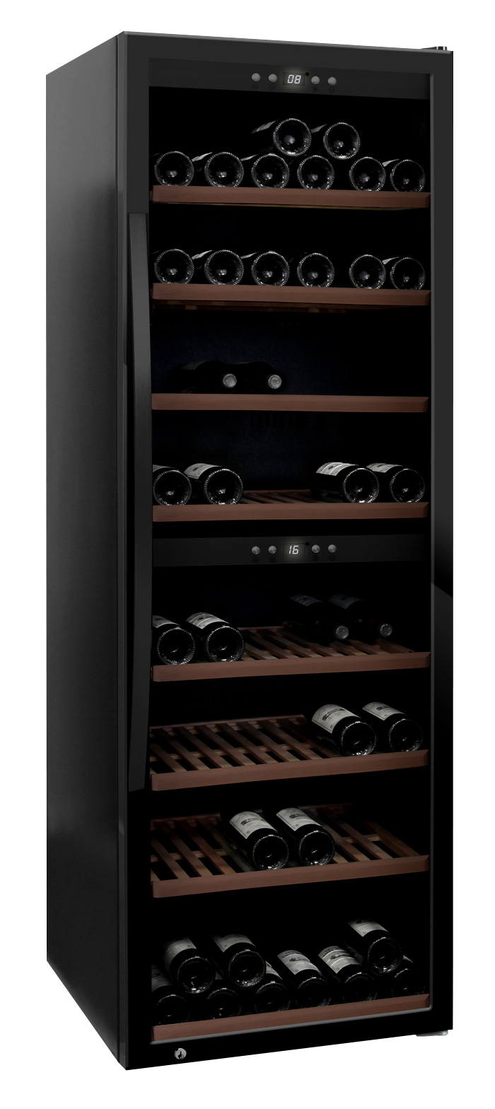 Stilren och modern vinkyl från mQuvée. Vinkylen kommer i svart design, med ergonomiskt handtag och trähyllor för det där lilla extra. Denna vinkyl har UV-skyddad glasdörr för att förvara vinerna på bästa vis. Vinkylen har 2 justerbara temperaturzoner och rymmer 180 flaskor.