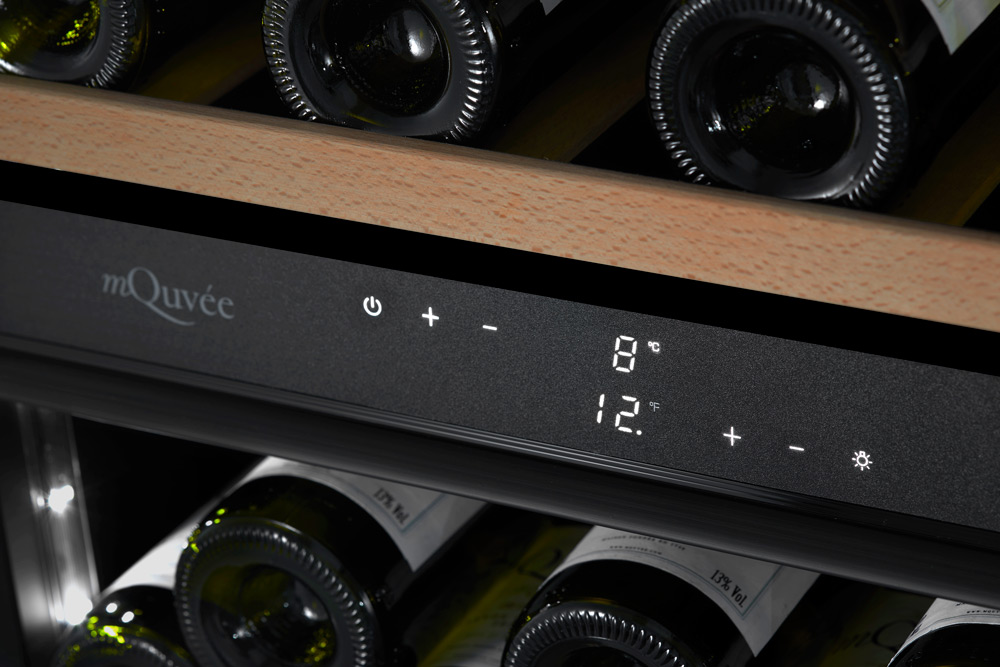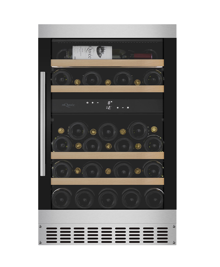 En vinkyl med kombinerad dörr i svart och rostfri finish från mQuvée, som med sin bredd på 50 cm gör den helt unik på marknaden. Utmärkt att bygga in under köksbänken eller varför inte ha den som en fristående vinkyl. Med dess stilrena utseende och klassiska trähyllor får du en läcker detalj i ditt hem. Placera dina vinflaskor i kylen och förvara dem med stil!