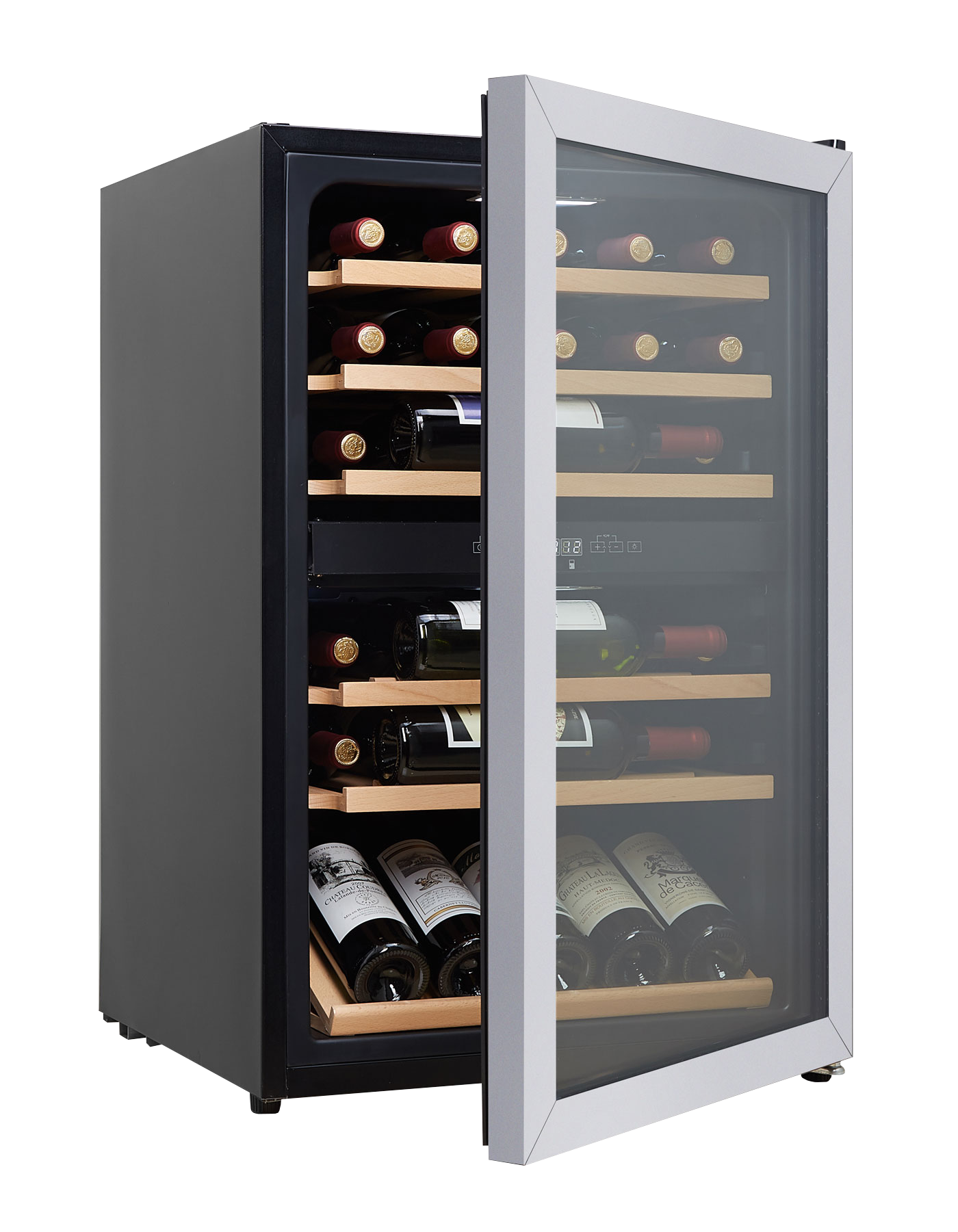 Fristående vinkyl med två justerbara temperaturzoner och plats för 37 flaskor. Vinkylen från skandinaviska Cavin har en UV-skyddad glasdörr, elektronisk reglering och kompressorkylning. Längst ner i vinkylen finns en displayhylla som ger dig möjligheten att visa upp ett urval av de vinerna du tycker om lite extra.