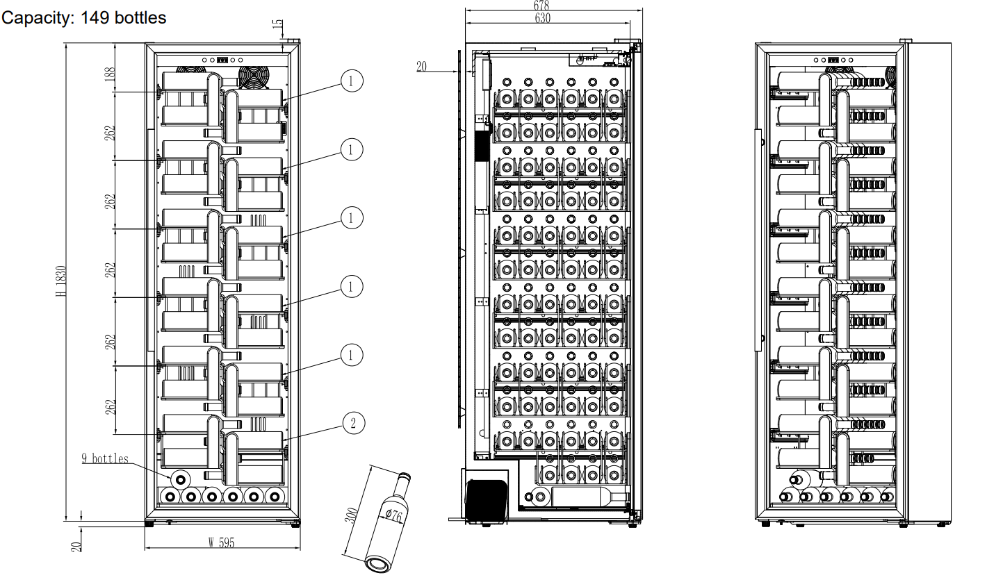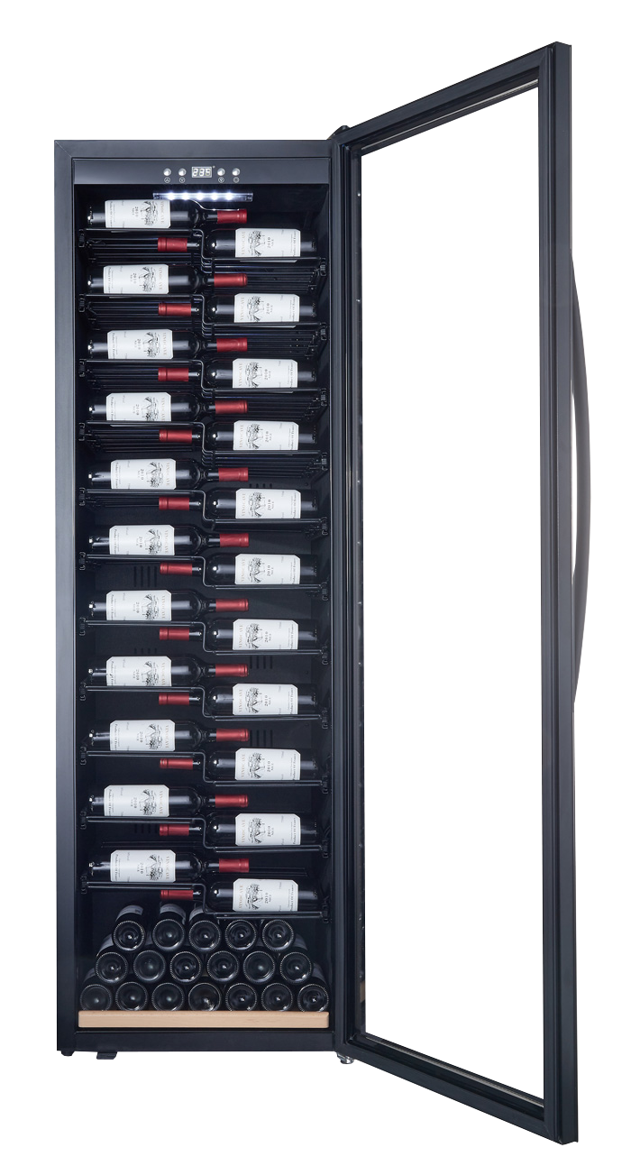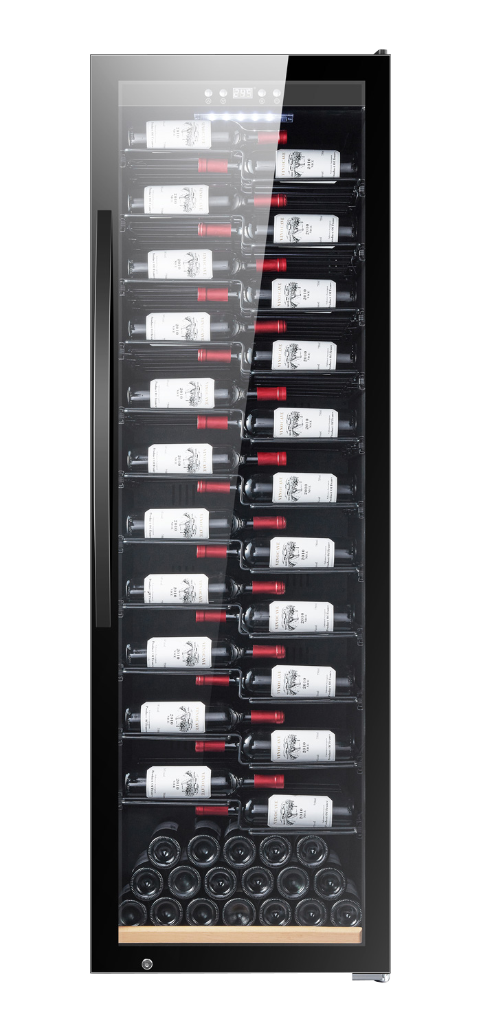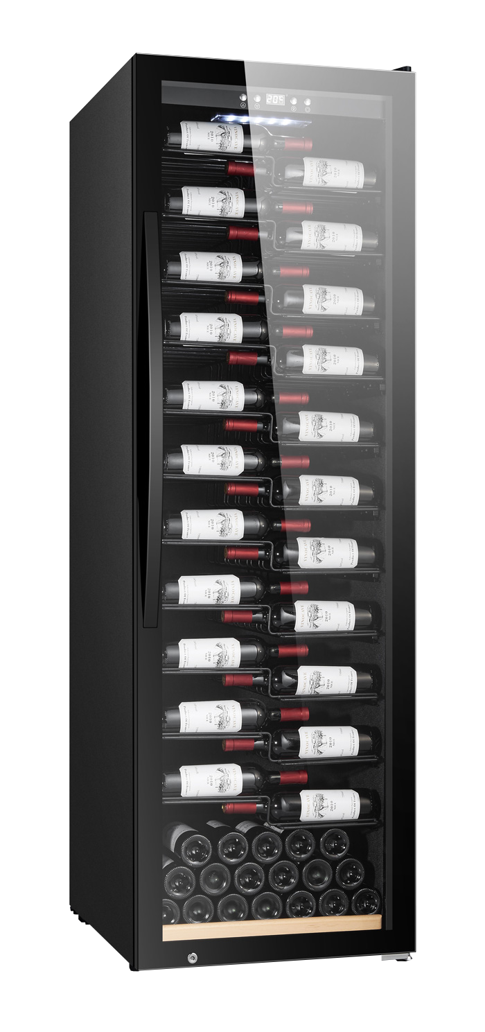 Modern och stor vinkyl med 11 utdragbara hyllor i label-view-modell som gör vinflaskornas etiketter väl synliga. Den svarta vinkylen är fristående och utrustad med en justerbar temperaturzon, ergonomiskt handtag och en UV-skyddad glasdörr som skyddar vinerna från skadligt solljus. Vinkylen rymmer 153 flaskor.