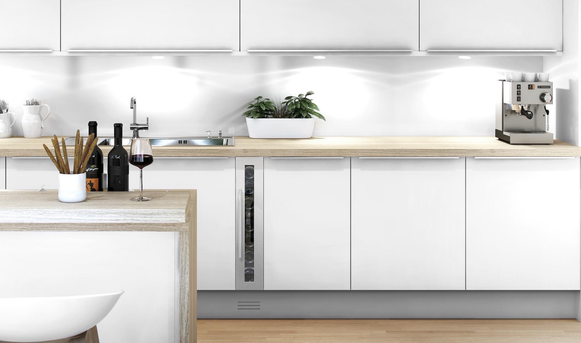 Mindre inbyggbar vinkyl med plats till 7 flaskor från mQuvée. Vinkylen kan enkelt byggas in under köksbänken och är perfekt för dig med mindre plats. Med stilren rostfri design och dörr utan skarvar lyfter denna vinkyl ditt kök!