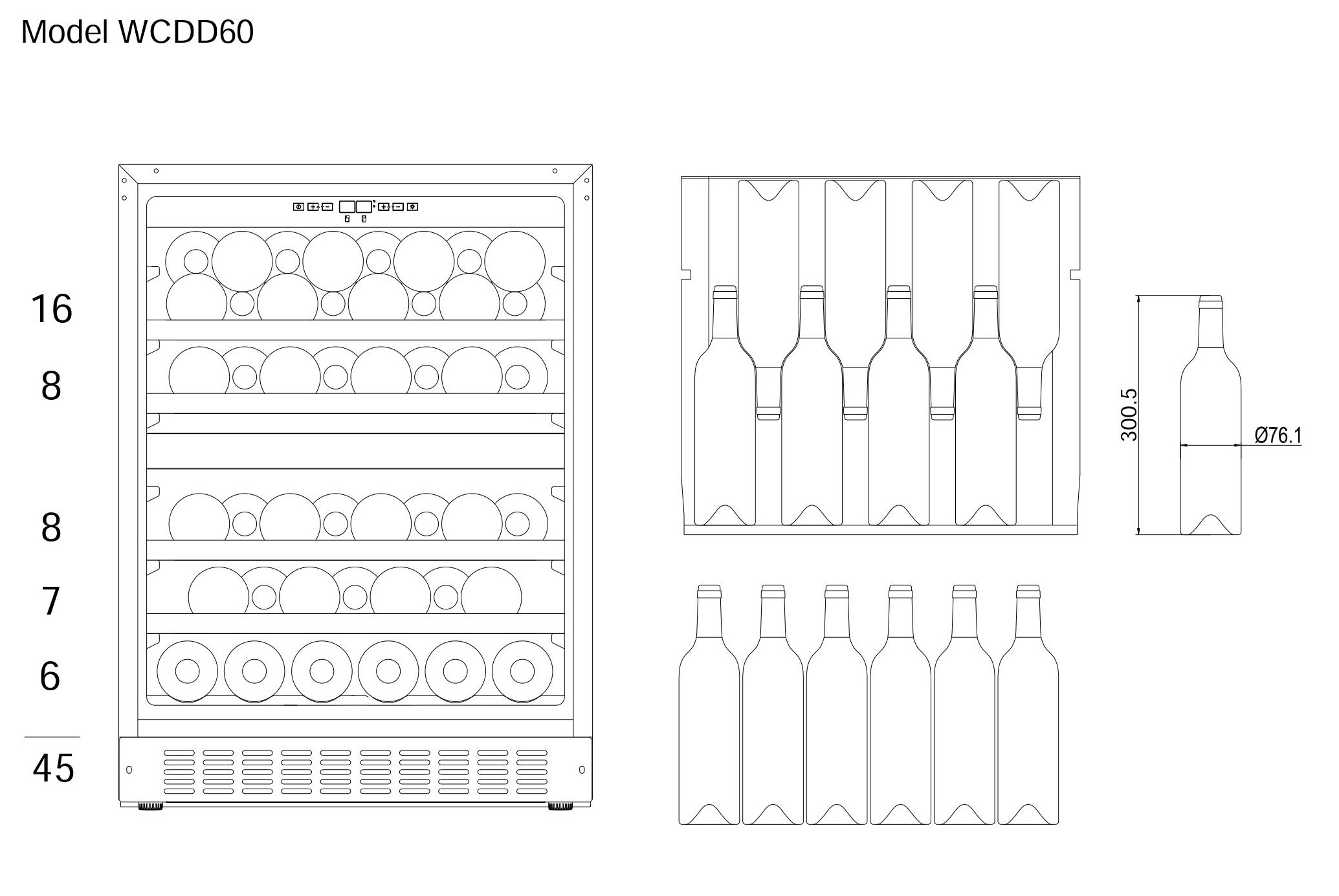 Helt svart glansig modell med 5 utdragbara hyllor och 2 justerbara temperaturzoner med display på insidan. Denna vinkyl rymmer 45 flaskor.