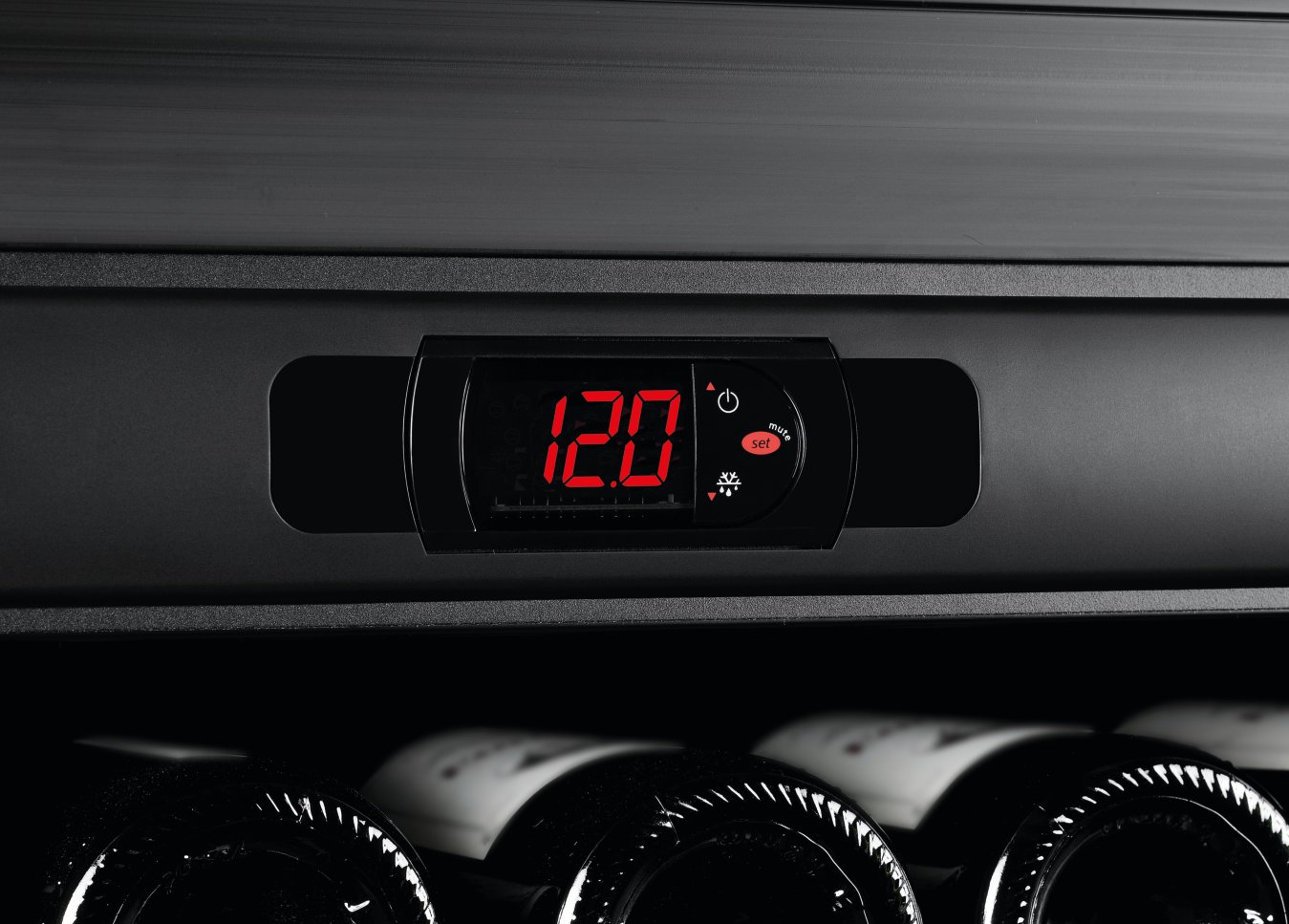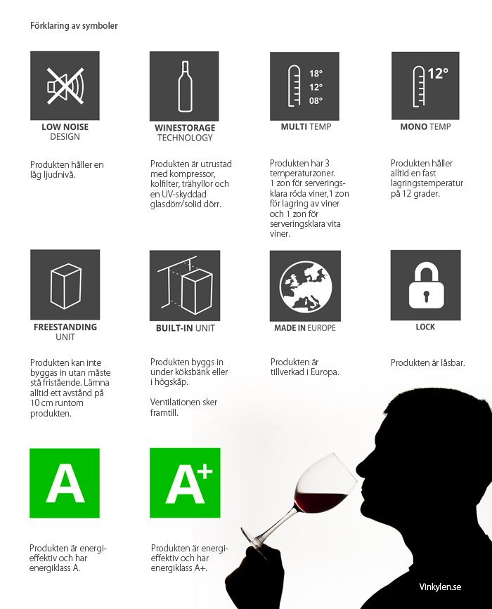 • Skåpet håller tre olika temperatur. Totalt finns ett temperaturspann på cirka 8-20 grader. I botten förvarar du serveringsklart vitt eller rosévin. I mitten lagrar du vin och i toppen förvarar du serveringsklart rött vin.