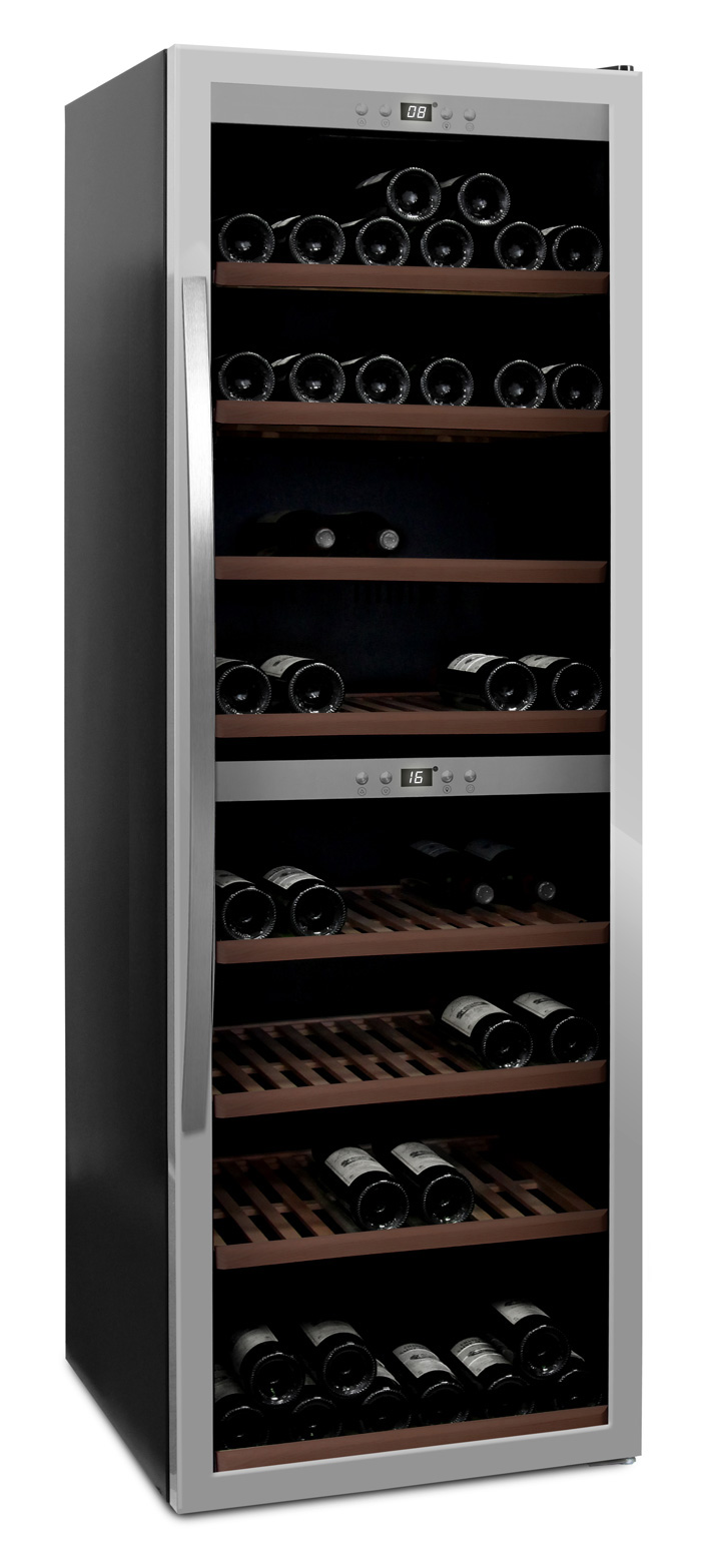 Stilren och modern vinkyl från mQuvée. Vinkylen kommer i rostfri design, med ergonomiskt handtag och trähyllor för det där lilla extra. Denna vinkyl har UV-skyddad glasdörr för att förvara vinerna på bästa vis. Vinkylen har 2 justerbara temperaturzoner och rymmer 180 flaskor.
