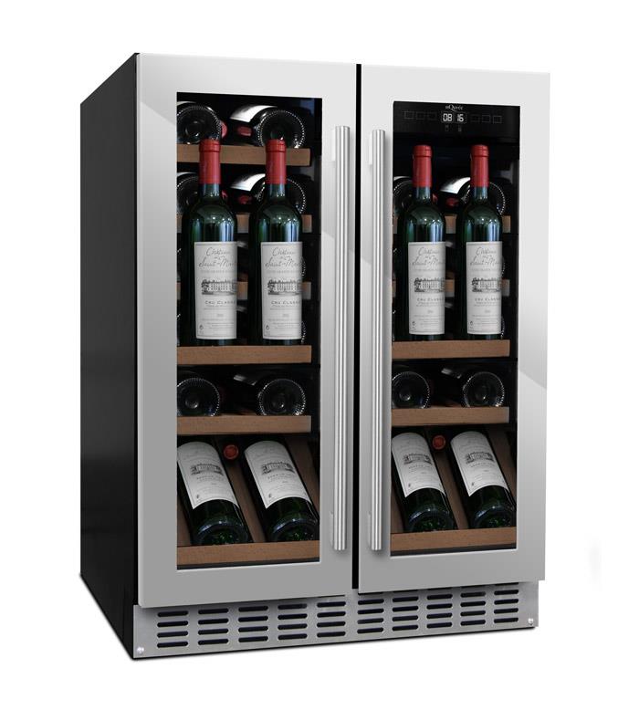 Stilren rostfri vinkyl från mQuvée med presentationshyllor, dubbeldörr och mått anpassade för den Skandinaviska marknaden. Vinkylen har 2 justerbara temperaturzoner – idealiskt för att du ska kunna förvara serveringsklara röda och vita viner i samma vinkyl. Fungerar både som fristående och som inbyggd under köksbänken. Kapacitet för totalt 31 flaskor.