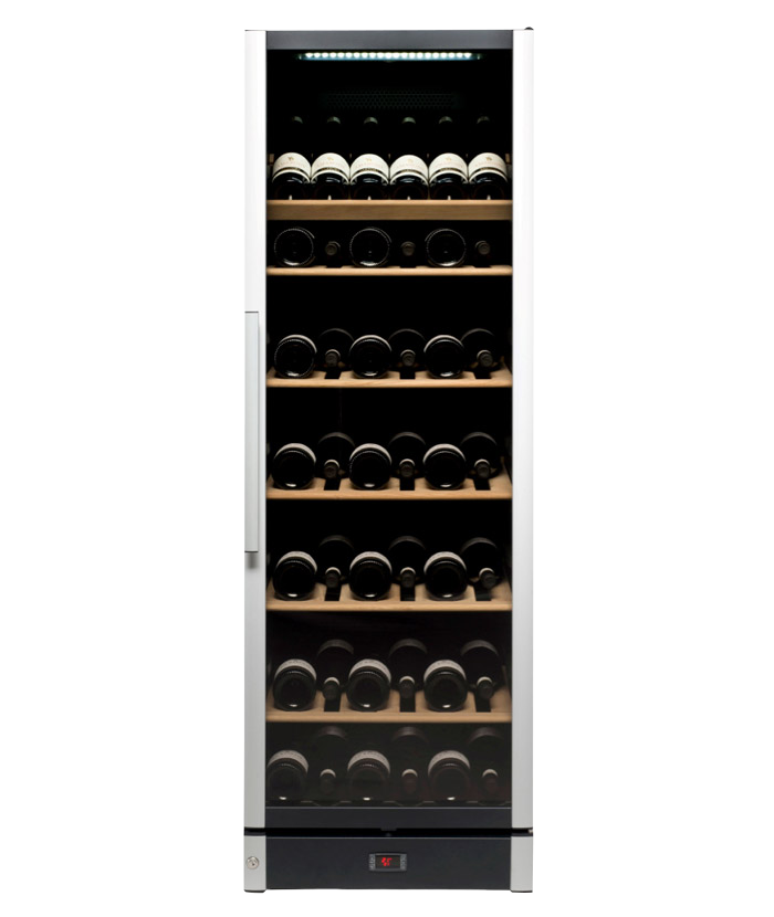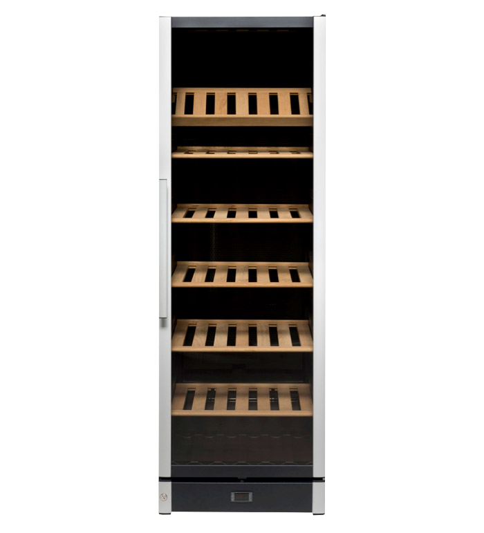 Stor fristående vinkyl i modern design, tillverkad i Danmark. Vinkylen har en ställbar temperatur i toppen och botten, övergången däremellan sker gradvis. Vinkylen har plats till 197 flaskor och kommer med en elegant presentationshylla!