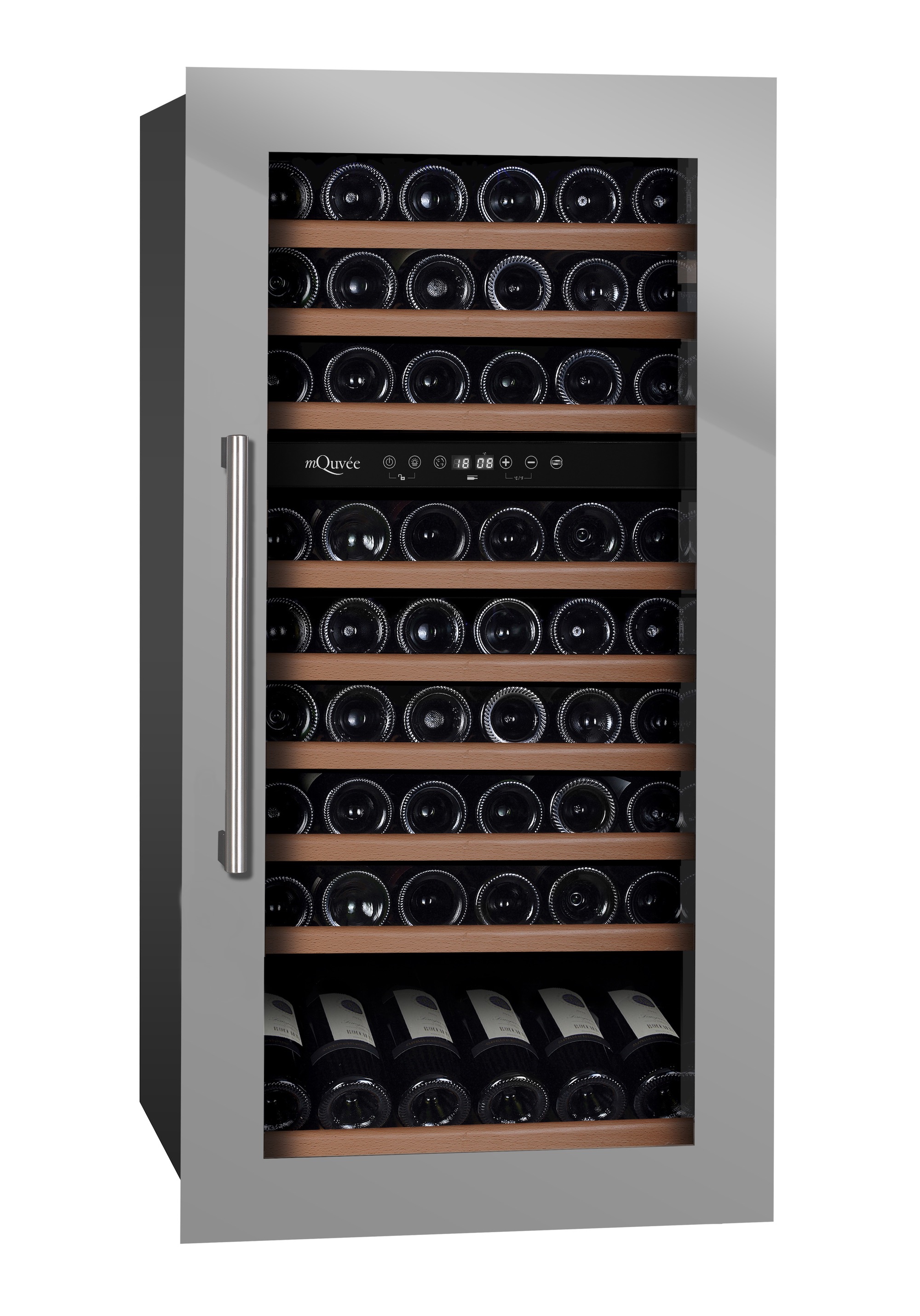 Stilren integrerbar vinkyl med rostfri finish som rymmer 78 flaskor. Denna vinkyl från mQuvée har två justerbara temperaturzoner och 8 utdragbara trähyllor - perfekt för att kyla både rött och vitt vin i.