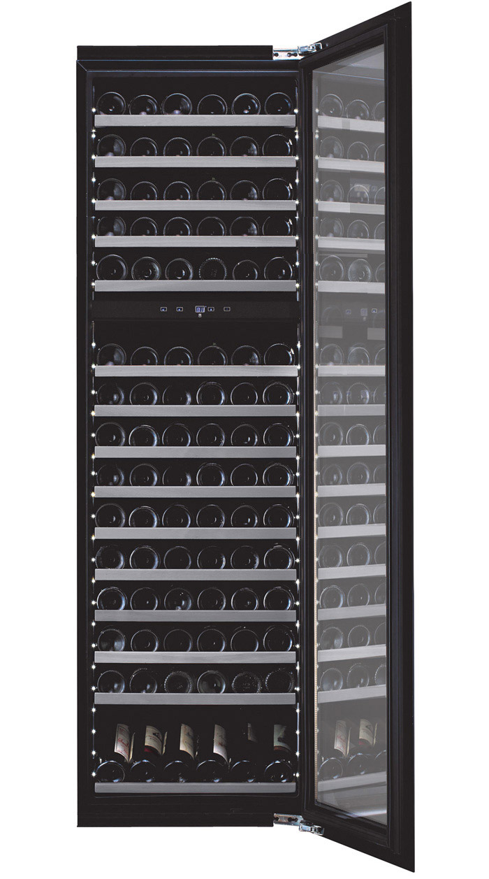 Exklusiv nyhet! Innovativ integrerbar vinkyl för dig som gillar att variera mellan olika sorters vin! Tack vare vinkylens två justerbara temperaturzoner kan du kyla flera viner med olika serveringstemperaturer samtidigt. Vit belysning och stålfronter på alla 14 trähyllor ger en stilfull inredning som kompletteras av smarta detaljer, bland annat en displayhylla där du kan presentera dina viner som du vill framhäva lite extra.