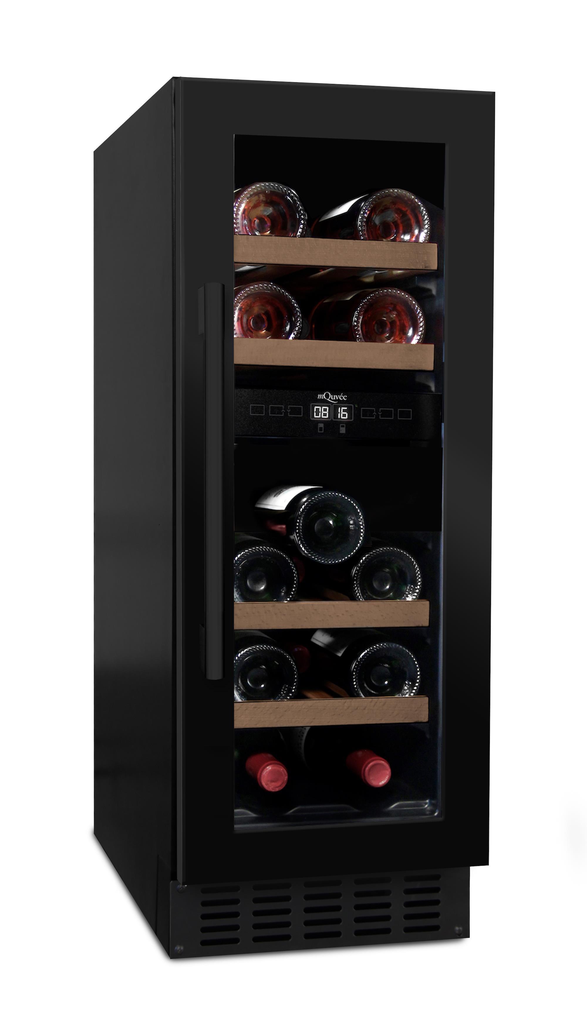 Stilren och energisnål vinkyl från mQuvée i mattsvart design och seamless-door (dörr utan skarvar). Vinkylen passar perfekt som inbyggd under köksbänken, men gör sig även snygg som fristående. Vinkylen har två temperaturzoner, kolfilter, 4 utdragbara hyllor i trä och plats för 16 flaskor.