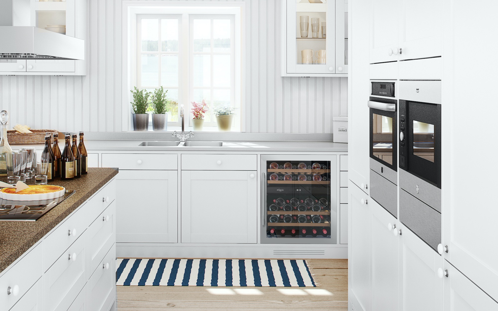 Snygg inbyggbar vinkyl från mQuvée som kommer med en unik dörr som har en höjd på 700 mm - för att passa in i det skandinaviska hemmet. Vinkylen går enkelt att bygga in under köksbänken och kan även användas som fristående. Med stilren rostfri design, två temperaturzoner och en dörr utan skarvar får du en vinkyl som lyfter hela ditt kök. Vinkylen har energiklass F, kolfilter, 4 utdragbara trähyllor och plats till 45 flaskor.