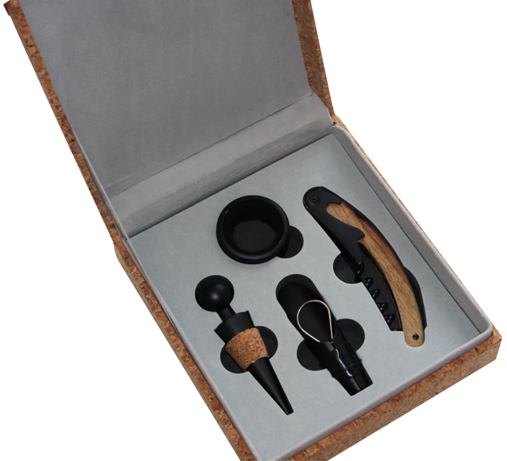 Exklusivt presentset med allt du kan tänkas behöva för att servera vin på ett stilrent sätt. Presentsetet från mQuvée innehåller en korkskruv, en luftare, en champagnekork och ett droppstopp i svart med eleganta detaljer i kork och trä.